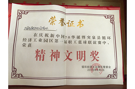在慶祝新中國70華誕暨突泉縣循環經濟工業園區第一屆職工籃球聯誼賽中,榮獲“精神文明獎”
